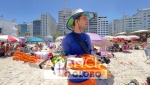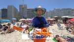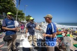 Rio de Janeiro (RJ), 21/11/2025 - Operação Verão 25/26 - Operação Verão: novas regras incluem retorno das garrafas de vidro às barracas e placas de orientação a banhistas - Agentes da Guarda Civil municipal atuam em fiscalização em pontos das zonas Sul e Sudoeste da cidade. Na foto, ambulante Henry Andy merma cerro peruano aponta celular para QR Code da placa no posto 6, em Copacabana, e constata sobre comércio ambulante proibido na orla. Foto: Ana Branco / Agencia O Globo